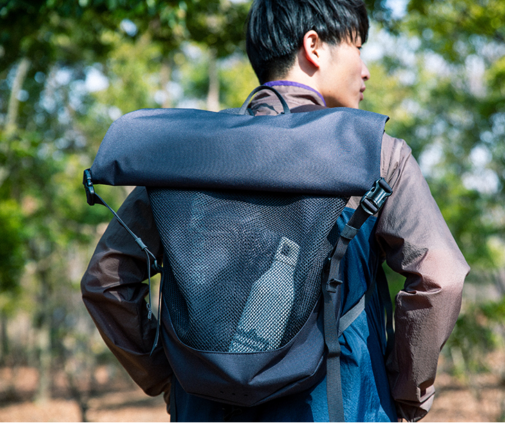 アクセスしやすいロールトップ型。フロントのメッシュポケットは、未使用時にはフラットに収まり、収納時には十分なスペースに広がります。